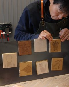 ボール盤で裏側に磁石をはめる穴を掘り、レーザー加工機でイラストを彫刻します。