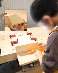 木の板を切ったり、板の端に飾りをつけたり、穴を開けたり木工工作を満喫してもらいました。