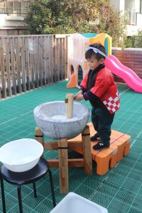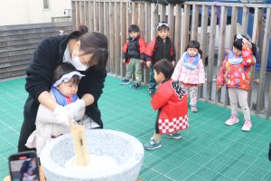 この間、タイセイが運営する保育園『都島こどもの国保育園』で餅つきイベントがあってん!